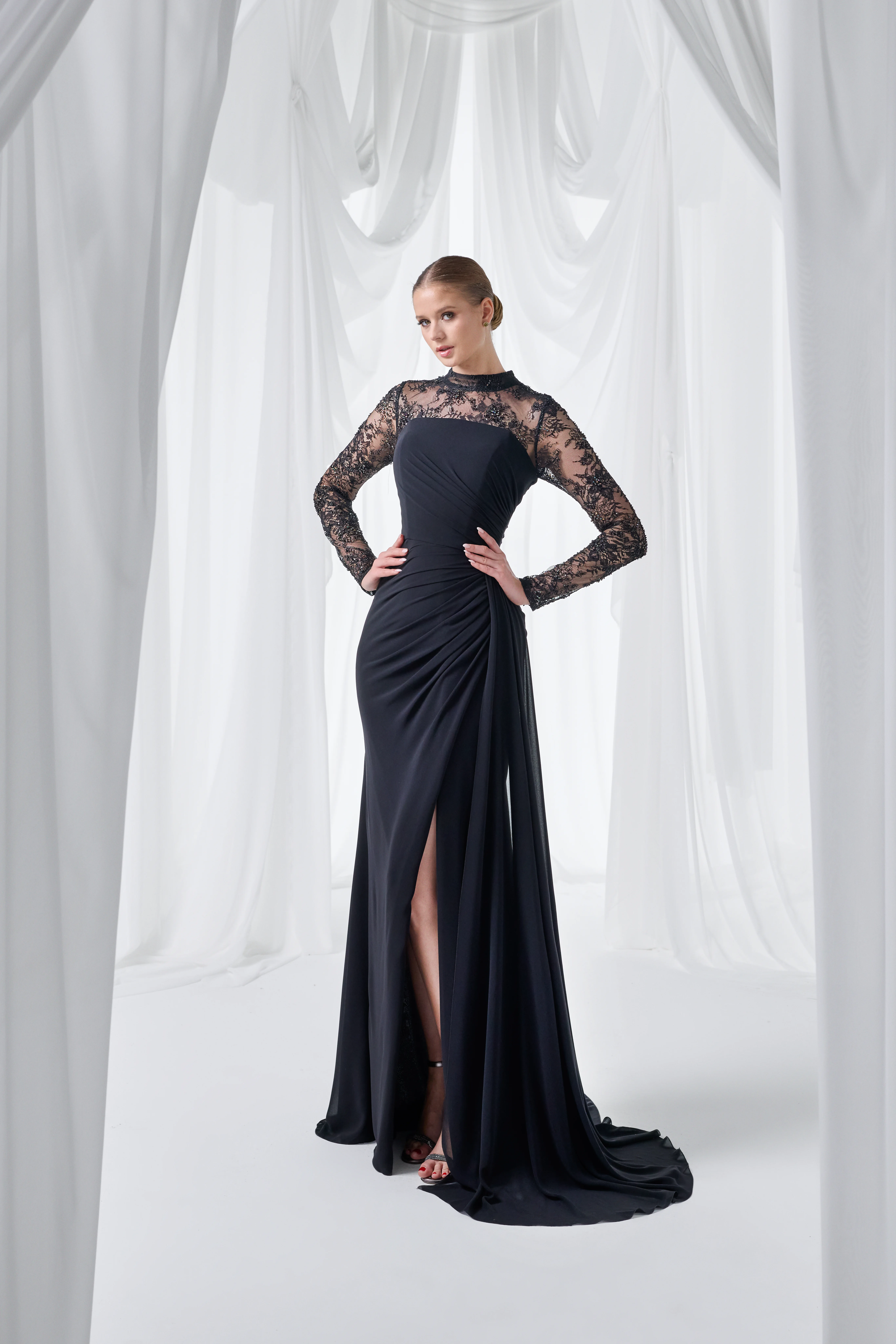 Transparan dantel kolları ve drapeli krep balık siluetiyle bu elbise, davet gecelerine zamansız bir siyah şıklığı ve rafine bir duruş kazandırır.