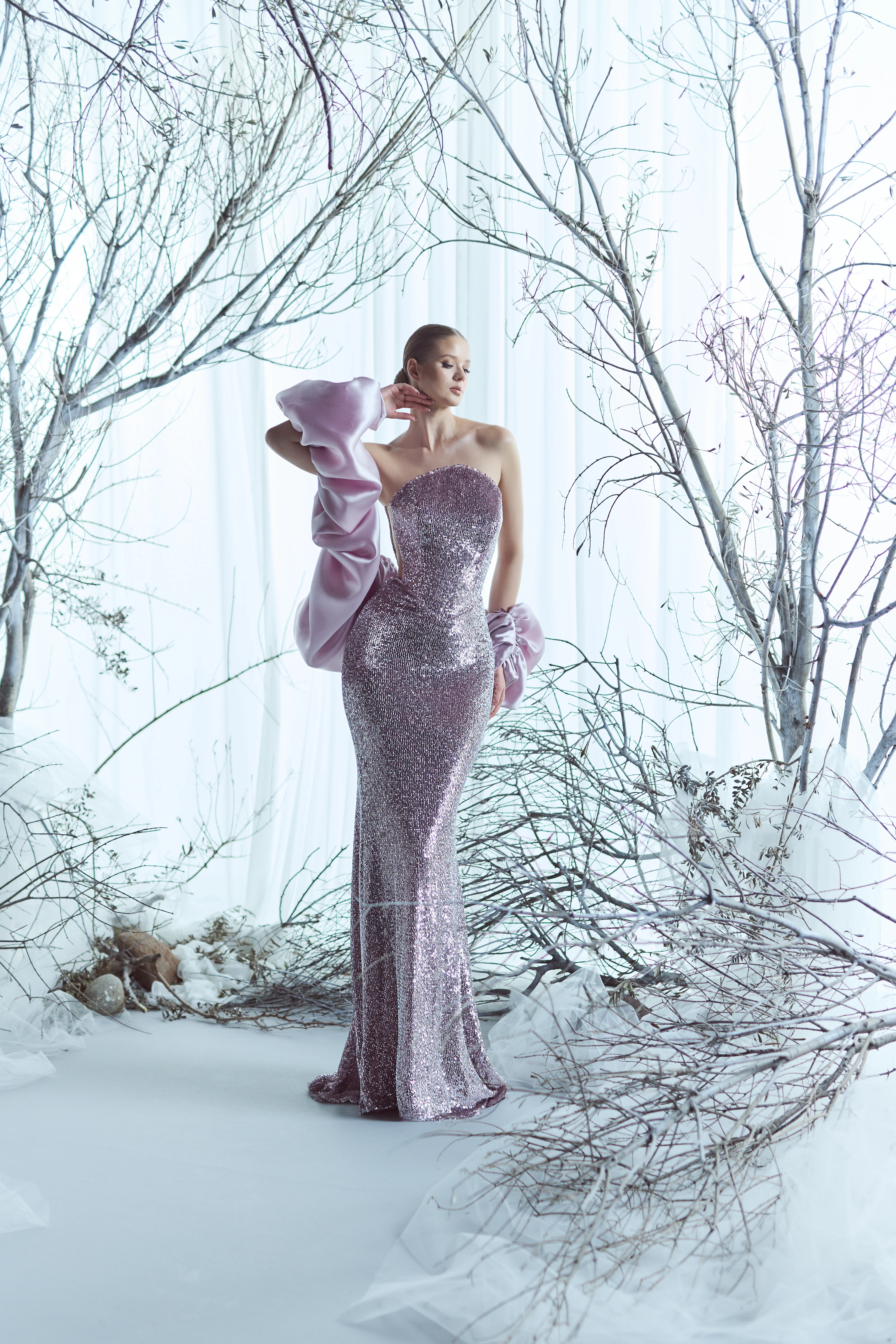 Straplez balık formu, baştan sona payet ışıltısı ve couture giydirme kol detayıyla bu elbise, düğün gecenize kırmızı halı etkisi katar.