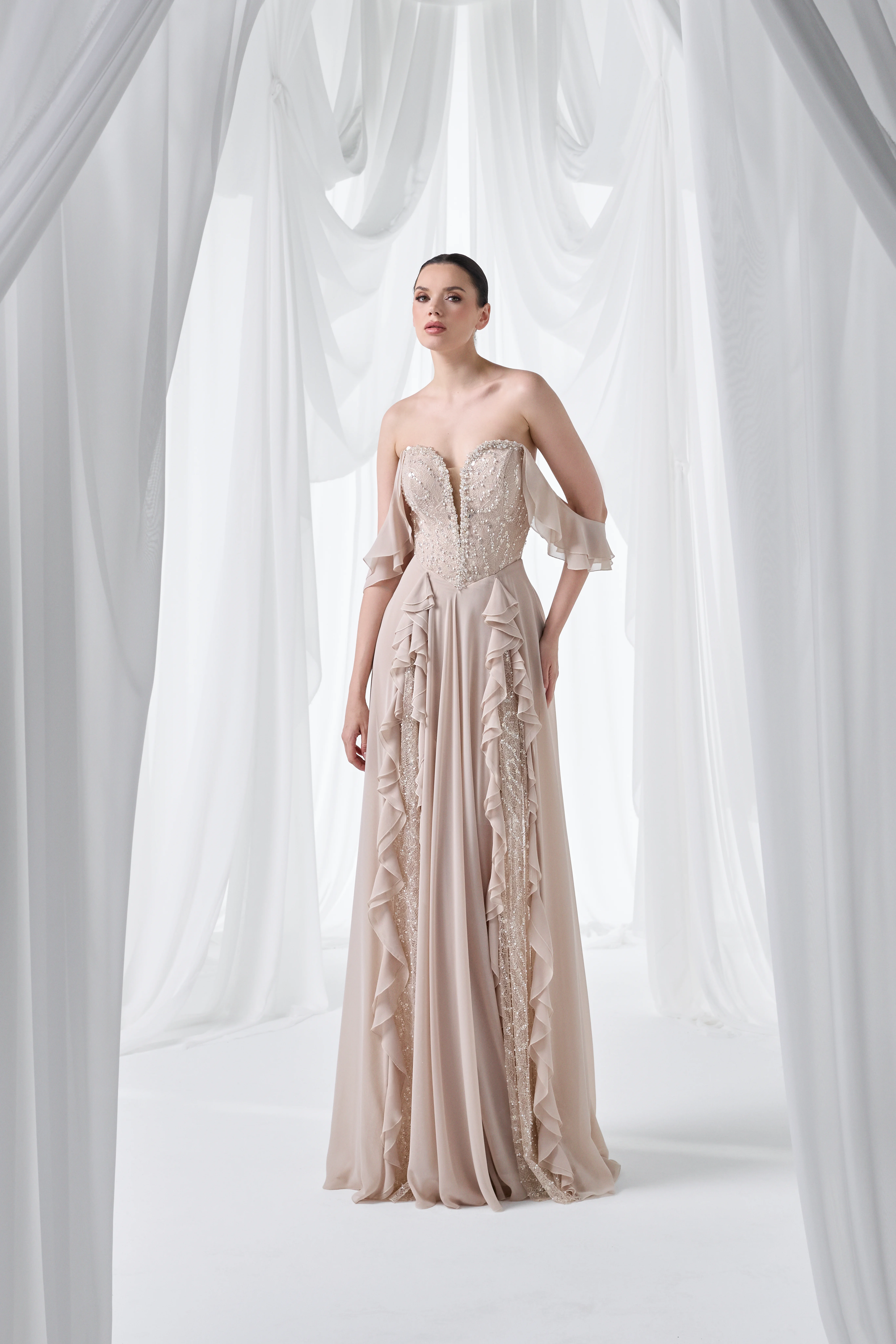 Etekteki kat kat fırfır detayları ve ışıltılı dantel paneller, ışığı zarifçe yakalayarak mezuniyet fotoğraflarında “özel gün” etkisini güçlendirir. Nude/şampanya tonunun sakin şıklığı sayesinde minimal topuklular ve inci-ışıltılı takılarla romantik; metalik aksesuarlarla daha iddialı bir stil kolayca kurulabilir. Hem sahnede hem de after-partide konforla şıklığı bir arada isteyenler için, unutulmaz bir mezuniyet seçimi.