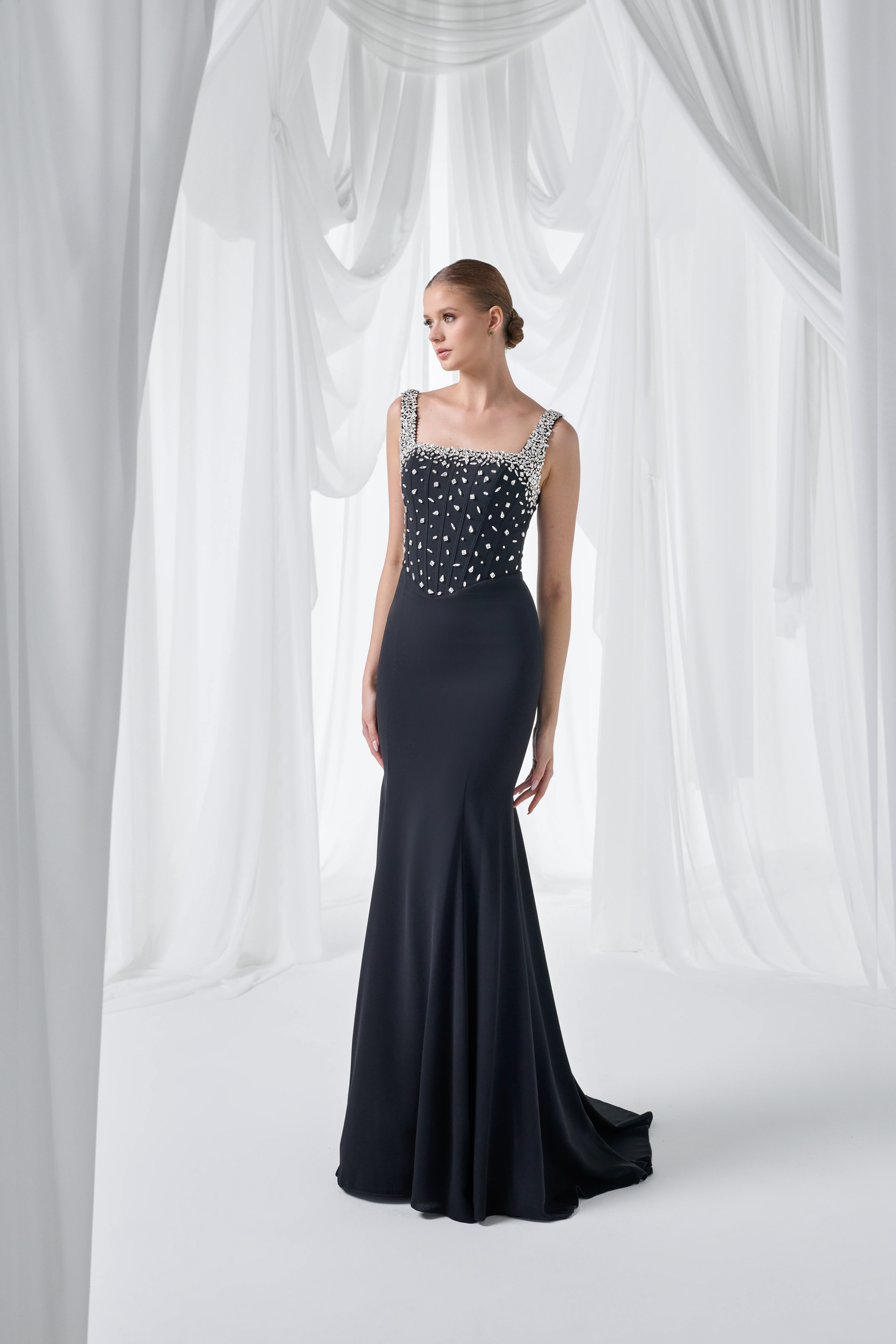 Taş işlemeli korsesi ve krep kumaş balık siluetiyle bu elbise, davet gecelerine zamansız bir siyah şıklığı ve couture bir ışıltı kazandırır.