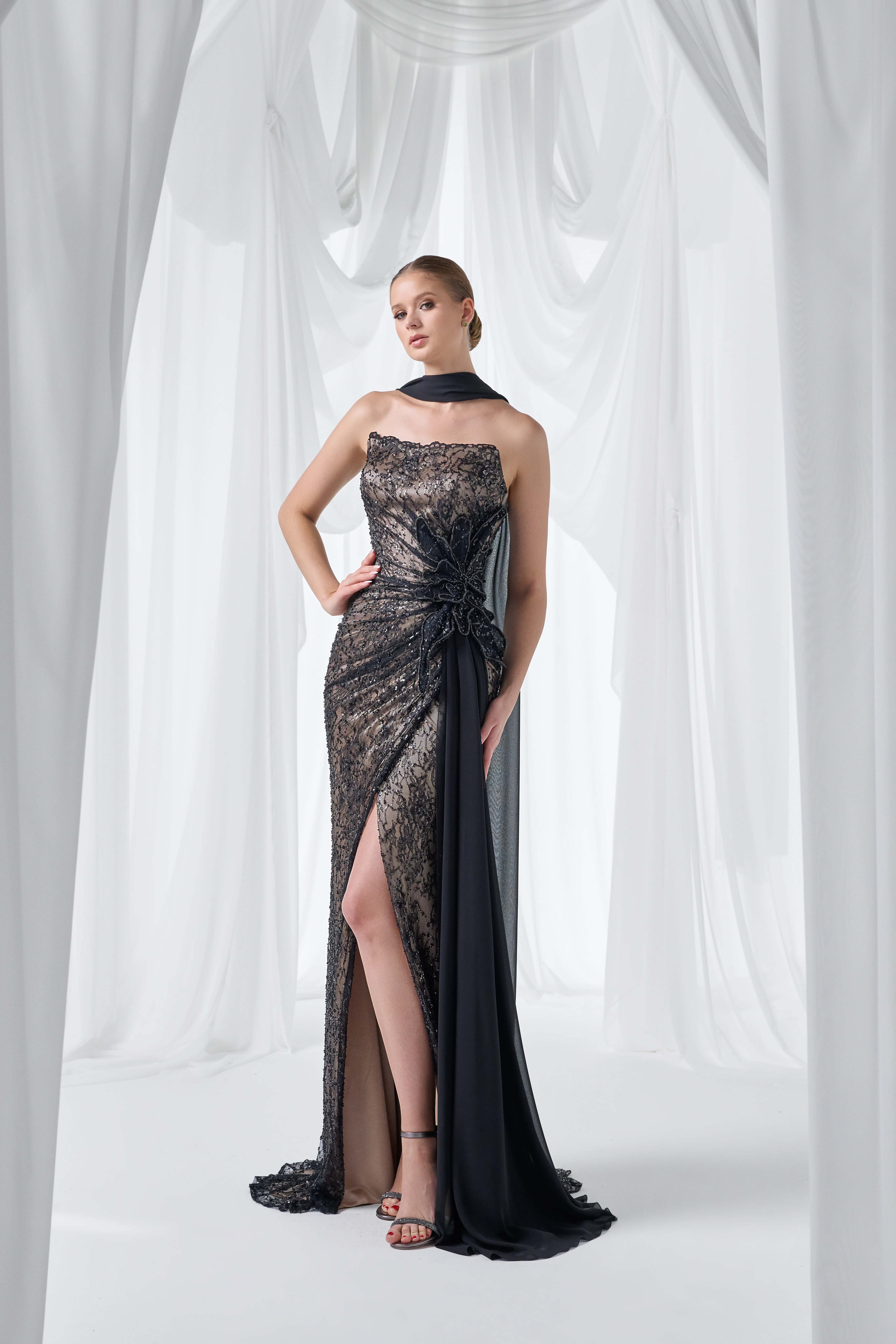 Dantel ve Taş Detaylı, Pelerinli Balık Elbise, düğün davetlerinde güçlü, sofistike ve “geceye damga vuran” bir stil arayanlar için tasarlanmış, couture hissi yüksek bir model. Straplez yaka formu omuz hattını zarifçe öne çıkarırken; dantel üzerindeki taş işlemeler ışığı yakalayıp elbiseye derin bir ışıltı kazandırır. Vücudu saran balık siluet, bel–kalça hattını kusursuzca vurgular; transparan dantel dokunun ten üzerinde yarattığı kontrast ise modern ve çekici bir etki sunar.