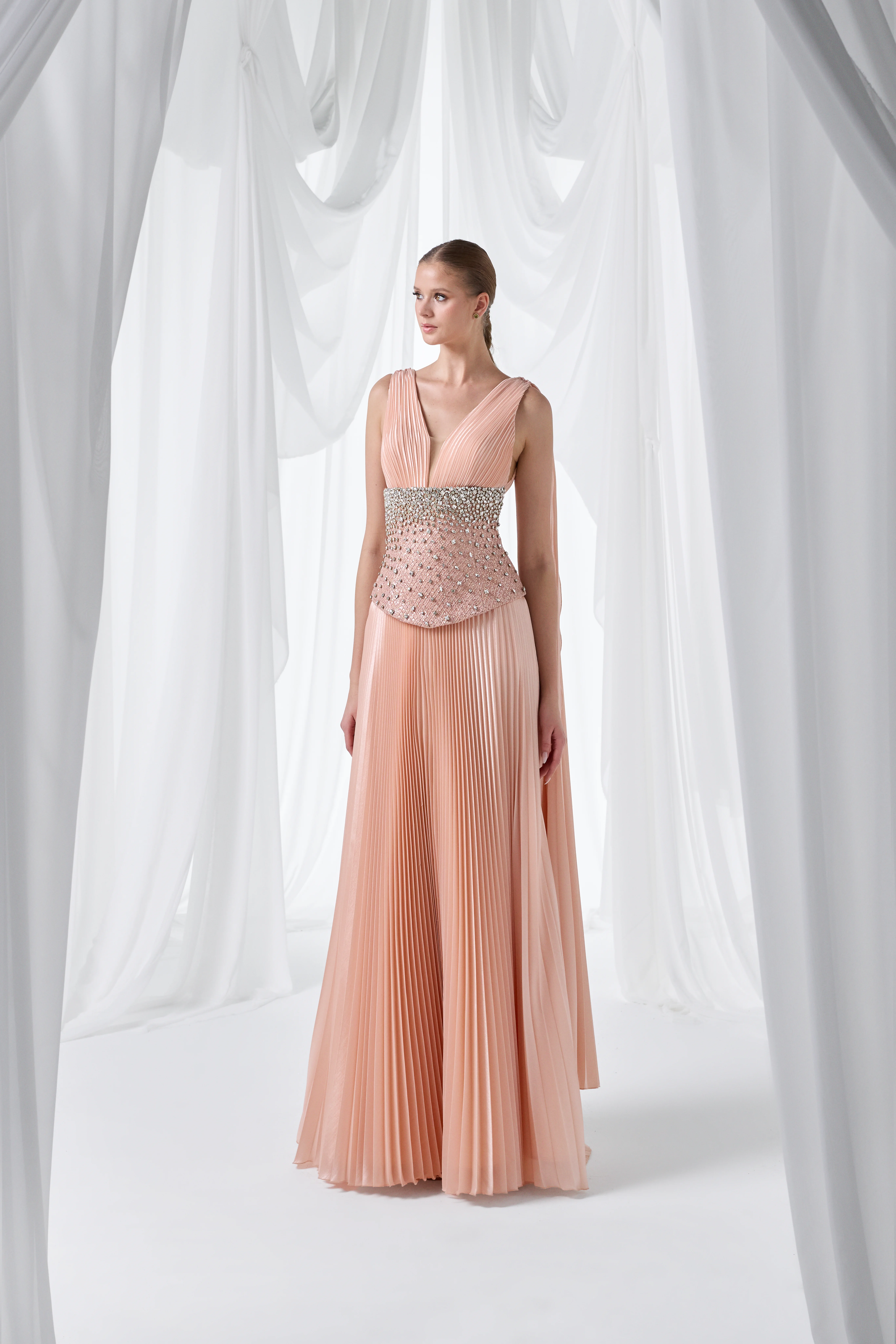 Şeftali–pudra tonunun romantik sıcaklığı, ışık altında yumuşak bir parlaklık vererek fotoğraflarda çok temiz ve sofistike bir etki yaratır. Uçuşan pliseli etek, yürüdükçe zarif bir hareket sağlarken; yalın ama güçlü tasarımı sayesinde düğünün her anına rahatça uyum sağlar. İnce bantlı topuklular ve minimal küpelerle modern, kristal dokunuşlarla daha ışıltılı bir stile kolayca dönüşen bu elbise, “gösterişsiz ama etkileyici” bir imza görünüm isteyenler için ideal.