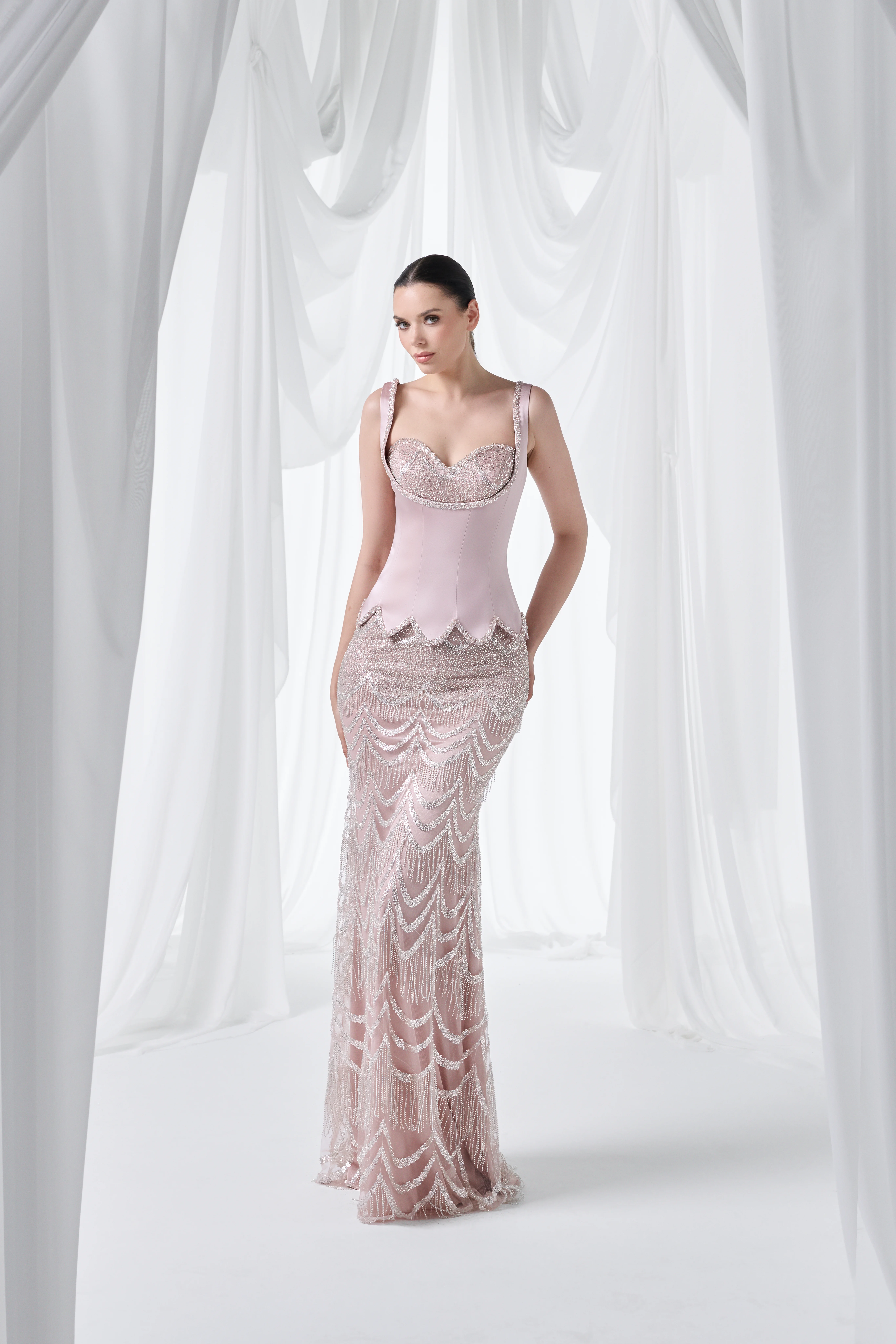 Etekteki yoğun taş işlemeli desen ve transparan tül dokunuşlar, balık formun vücudu saran etkisini daha da güçlendirir; hareket ettikçe dalga dalga parlayan bir ışıltı hissi verir. Pudra pembe tonunun romantik ve zarif havası; gümüş ya da kristal aksesuarlarla mükemmel uyum sağlar, saç–makyajda sade tercihlerle elbiseyi sahnenin yıldızı yapar. Nikâh sonrası kutlamadan düğün gecesi davetine kadar, tek parçada “gösterişli ama rafine” bir imza görünüm arayanlar için ideal bir seçim.