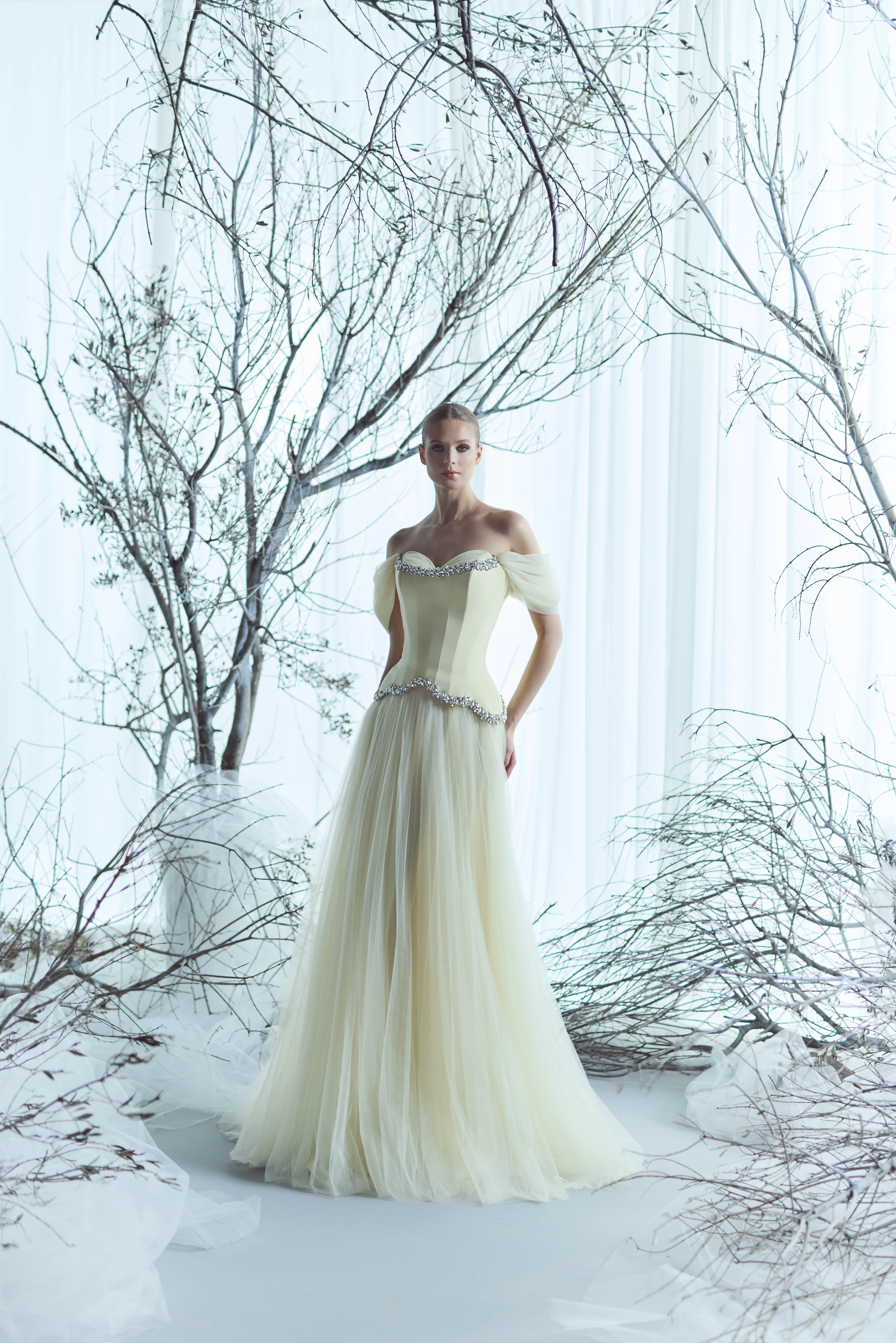 Korseli formu, taşlı vurguları ve kabarık tül eteğiyle bu elbise, nişan gününüze masalsı bir zarafet ve ışıl ışıl bir prenses silueti katar.