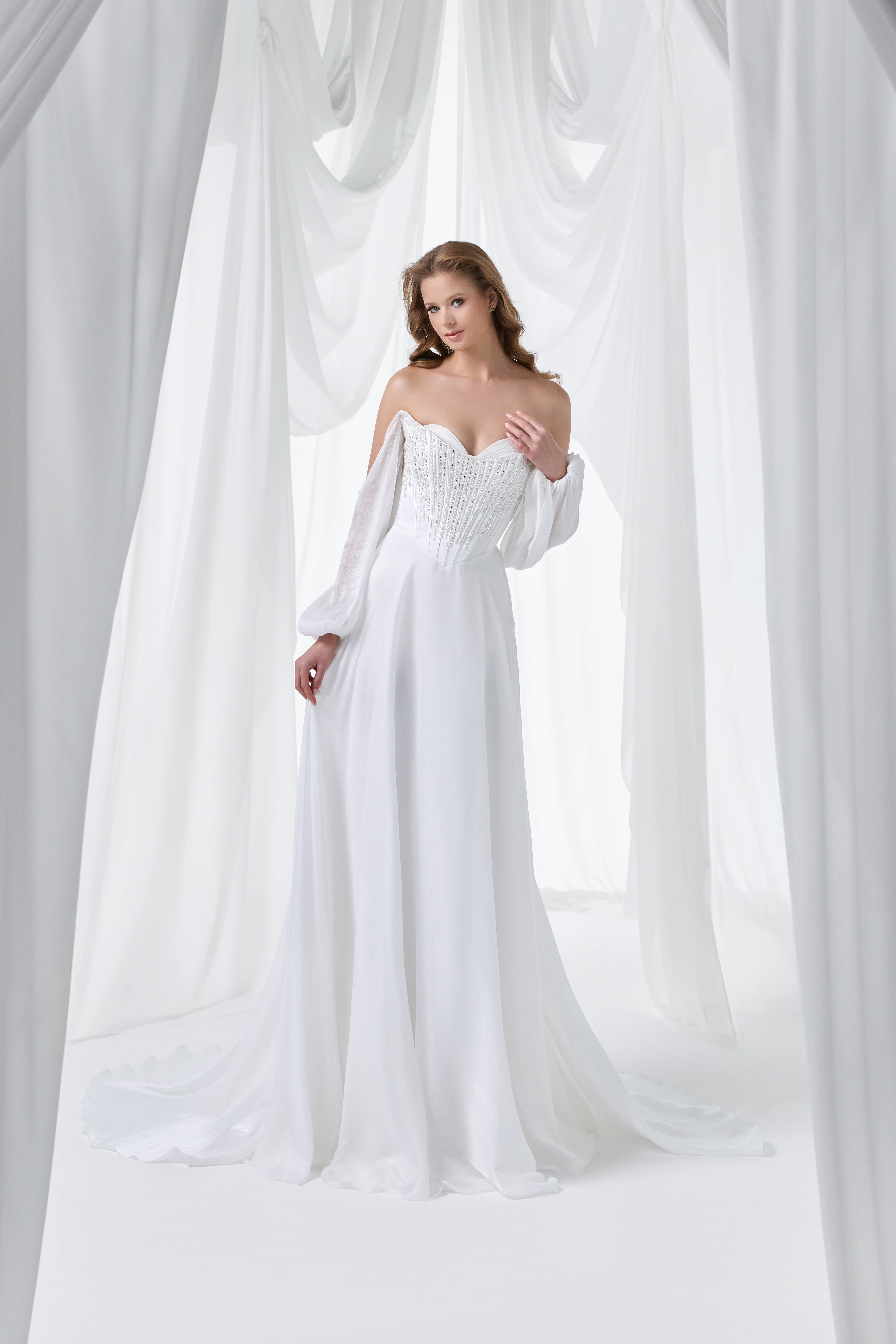 Korseli formu, organze kolları ve üst bedendeki zarif ışıltısıyla bu elbise, nişan gününüze romantik bir sadelik ve kusursuz bir siluet kazandırır.